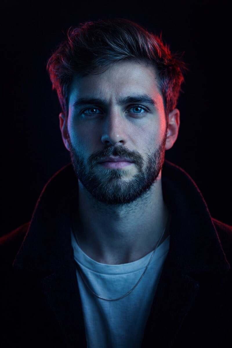 { "image_type": "studio portrait", "composition": { "framing": "tight head-and-shoulders close-up", "camera_angle": "eye-level", "orientation": "vertical", "symmetry": "near-perfect central symmetry", "focus": "sharp focus on eyes and facial features", "depth_of_field": "shallow, background fully blurred to black" }, "subject": { "description": "middle-aged male-presenting subject", "pose": "frontal, facing camera directly", "expression": "calm, confident, intense gaze", "eye_direction": "looking straight into lens", "facial_features": { "facial_hair": "short salt-and-pepper stubble and trimmed goatee", "skin_texture": "visible pores and fine lines, realistic skin detail", "eyes": "light-colored eyes emphasized by catchlights" }, "hair": { "style": "medium-length, brushed back", "texture": "natural, slightly tousled", "color": "dark brown with subtle gray highlights" } }, "wardrobe": { "top": "white crew-neck t-shirt", "outerwear": "dark jacket or coat with soft texture", "accessories": "thin chain necklace partially visible" }, "lighting": { "style": "cinematic, high-contrast neon lighting", "key_light": { "position": "front-left", "color": "cool cyan/blue", "effect": "dominant illumination across face and torso" }, "rim_light": { "position": "rear-right", "color": "saturated red/magenta", "effect": "strong edge highlight on hair and face contour" }, "fill_light": "minimal to none", "contrast_level": "high", "mood": "dramatic, futuristic, intense" }, "color_palette": { "dominant_colors": ["cyan blue", "deep red", "black"], "color_temperature": "mixed cool and warm neon tones", "saturation": "high saturation on lighting, neutral clothing tones", "color_grading": "stylized cyberpunk-inspired grading" }, "background": { "environment": "studio", "details": "pure black background with no visible texture or objects", "separation": "strong subject-background separation via rim lighting" }, "technical_details": { "camera_style": "professional studio photography", "lens_effect": "slight compression typical of portrait lens", "estimated_focal_length": "85mm equivalent", "image_sharpness": "high", "noise": "minimal", "dynamic_range": "controlled highlights with deep shadows" }, "artistic_style": { "genre": "cinematic portrait", "influences": ["cyberpunk", "neo-noir", "editorial fashion"], "visual_aesthetic": "bold, modern, high-impact", "post_processing": { "skin_retouching": "subtle, realistic", "color_enhancement": "strong split-toning blue/red", "clarity": "enhanced micro-contrast" } }, "overall_impression": { "tone": "powerful and enigmatic", "intended_use": "editorial, album cover, cinematic poster, AI style reference", "style_recreation_keywords": [ "cinematic neon portrait", "blue and red split lighting", "black background", "intense direct gaze", "cyberpunk color grading", "high-contrast studio lighting" ] } }