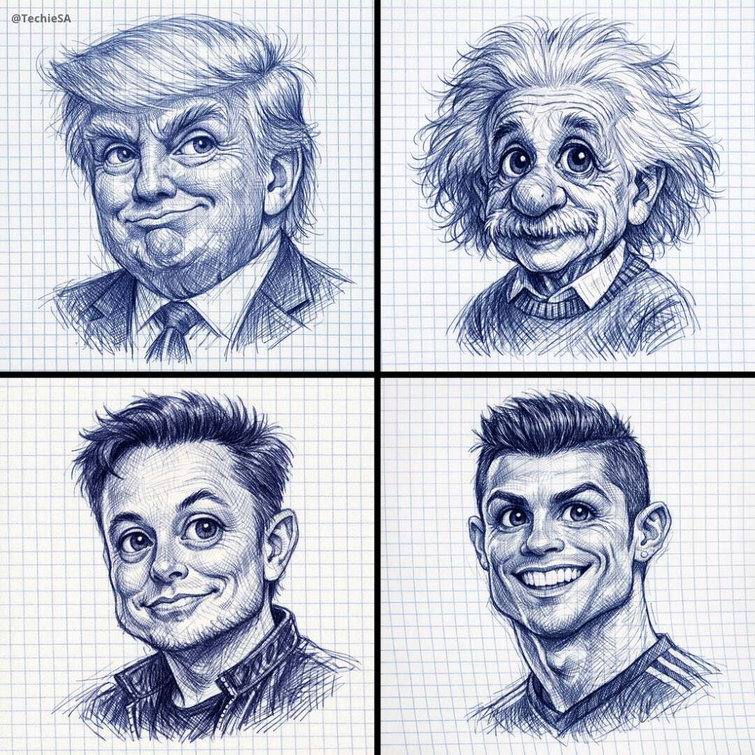 A detailed ballpoint pen sketch of [CHARACTER] drawn on checkered notebook paper, 1080x1080. The drawing style is expressive and textured, showing fine pen strokes and cross-hatching. [CHARACTER] is depicted with slightly exaggerated proportions — big expressive eyes and distinctive features — in a humorous but artistic caricature style. The background is simple checkered paper with no logos or text, giving it a clean hand-drawn notebook look