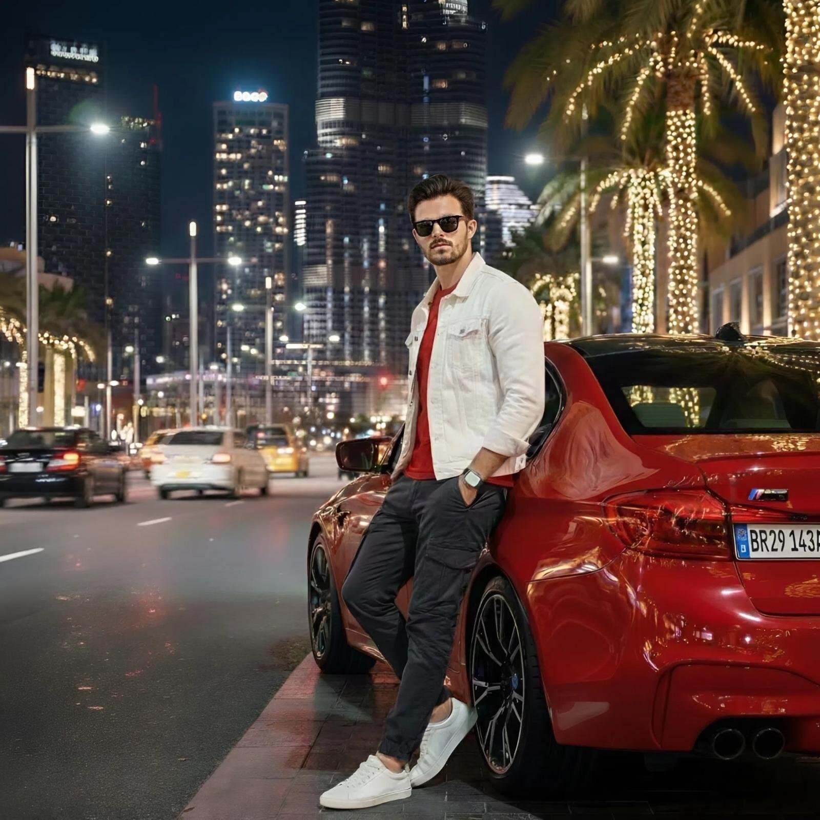 { "scene": { "location": "Modern city street at night", "background_elements": [ "Illuminated skyscrapers", "Palm trees wrapped in warm fairy lights", "Motion-blurred car headlights and tail lights", "Strong bokeh effect in the background" ], "lighting": "Cinematic soft directional lighting with urban reflections" }, "character": { "description": "Stylish young man with dark hair", "clothing": { "outerwear": "White denim jacket", "innerwear": "Fitted yellow crew-neck t-shirt", "bottoms": "Dark grey slim-fit cargo pants", "footwear": "Clean white sneakers" }, "accessories": [ "Black classic sunglasses", "Luxury silver wristwatch" ], "pose": "Casual leaning against the front of a car with hands in pockets", "expression": "Confident smile" }, "vehicle": { "make_model": "Red BMW M5", "details": "High-gloss metallic red paint, iconic kidney grille", "position": "Parked centrally on an asphalt city road" }, "technical_style": { "quality": "High-resolution photography", "aesthetic": "Professional cinematic fashion shoot", "focus": "Sharp foreground detail with shallow depth of field" } }
