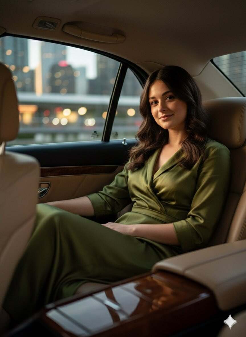 { "render_goal": "Narrative cinematic fashion portrait", "subject": { "pose": "female seated in the back seat, relaxed posture", "expression": "quiet confident smile" }, "wardrobe": "structured silk gown in deep olive", "environment": { "location": "luxury car interior", "props": "window light, city blur outside" } }