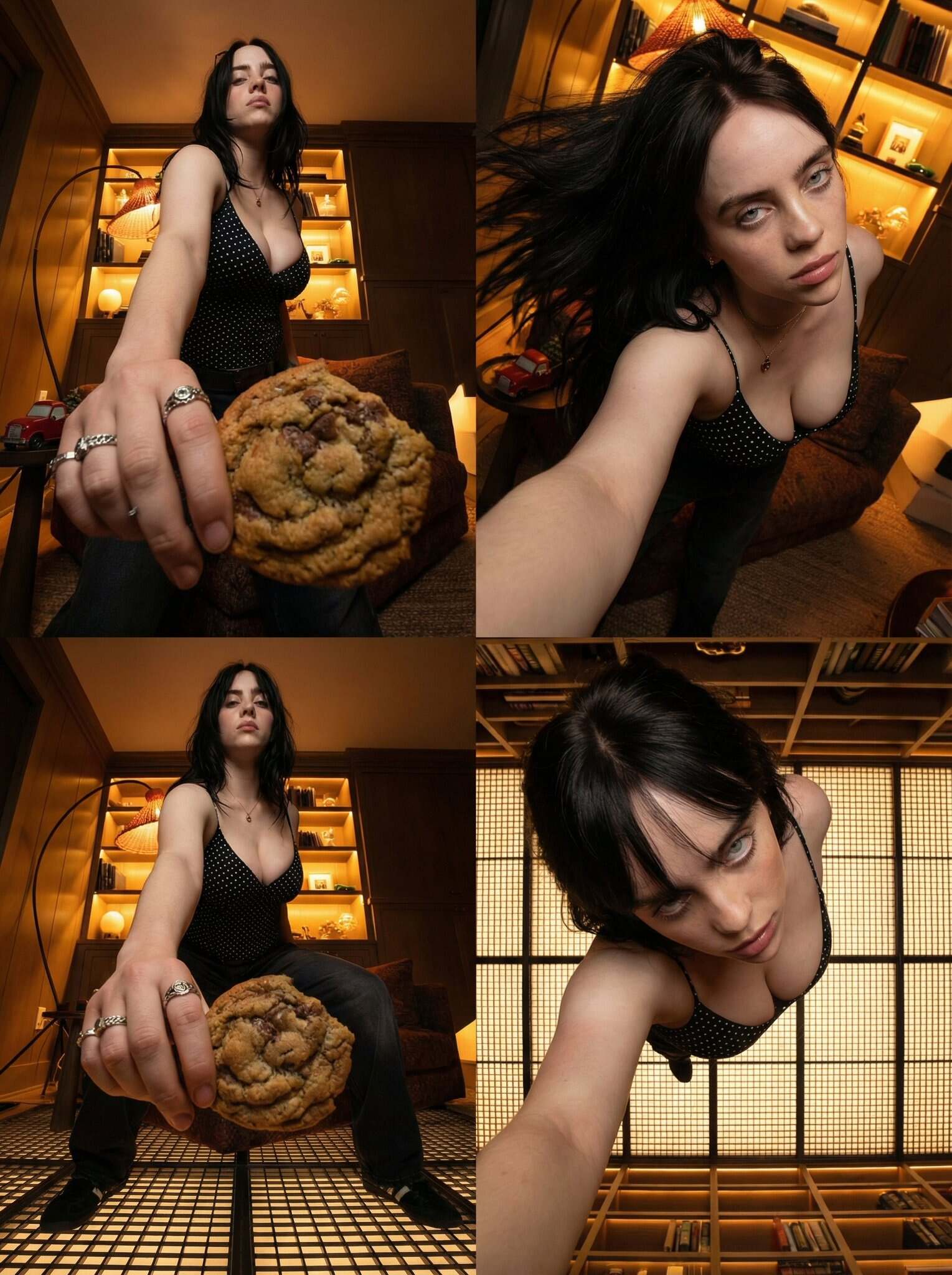 Create a 2x2 cinematic grid featuring the same characters and scene, must be all the frame with a different cinematic camera angle and shot must be different type. Each panel represents with a unique cinematic angle.