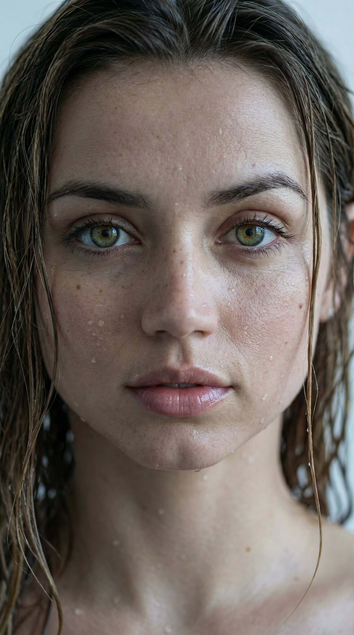 { "structured_prompt": { "shot_style": "Ultra-photorealistic close-up portrait, Hyper-realistic editorial photography, raw style, ultra-detailed, 8k resolution, Vogue/Harper’s Bazaar professional aesthetic, perfectly balanced composition.", "subject": "A world-class supermodel-level young woman.", "facial_structure": "Perfectly symmetrical facial structure, high cheekbones, sharp jawline, elegant straight nose, full natural lips.", "eyes": "Mesmerizing green-hazel eyes with deep clarity, realistic reflections, and captivating gaze.", "hair": "Dark blonde wet hair naturally clinging to face and neck.", "skin_and_texture": "Flawless skin with visible pores and subtle texture. Tiny, delicate water droplets evenly scattered across the face, glistening naturally and attractively, adding high-fashion wet beauty effect. Subtle sheen of sweat enhances realism. Soft, moist lips with natural texture.", "lighting": "Soft cinematic lighting, cool-toned cinematic lighting, soft shadows.", "background": "Light grey and white bokeh background." }, "negative_prompt": { "anatomy": "average face, asymmetrical features, flat or round face, bad anatomy, distorted eyes", "texture": "plastic/fake skin, heavy makeup, large or messy water droplets, artificial beauty", "quality": "low quality, blurry, pixelated, overexposed, harsh shadows, dull or lifeless eyes", "style": "cartoon, anime, illustration, 3d render, painting" }, "parameters": { "aspect_ratio": "9:16", "steps": 50, "cfg_scale": 9.5, "style": "Photorealistic" } }
