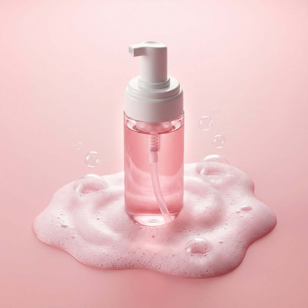 Premium minimalist skincare product photography. A translucent pink liquid cleanser bottle with a white pump dispenser placed vertically at the center of the frame. The bottle rests inside an organic pool of soft pink foamy bubbles, with airy soap lather spreading outward in smooth, rounded shapes. Small transparent bubbles float around the foam surface. Clean matte pastel pink background with subtle gradient. Soft diffused top lighting with gentle rim light creates a luminous glow through the liquid, highlighting the pump tube inside the bottle. Sharp focus, high clarity, realistic liquid refraction, smooth plastic and glass textures, luxury beauty advertising style, modern cosmetic branding, ultra-realistic, 8K detail, high dynamic range. Negative Prompt: hands, people, faces, clutter, harsh reflections, label distortion, unreadable text, warped pump, hard shadows, grain, noise, low resolution, CGI look, cartoon style, messy foam, uneven lighting, watermark