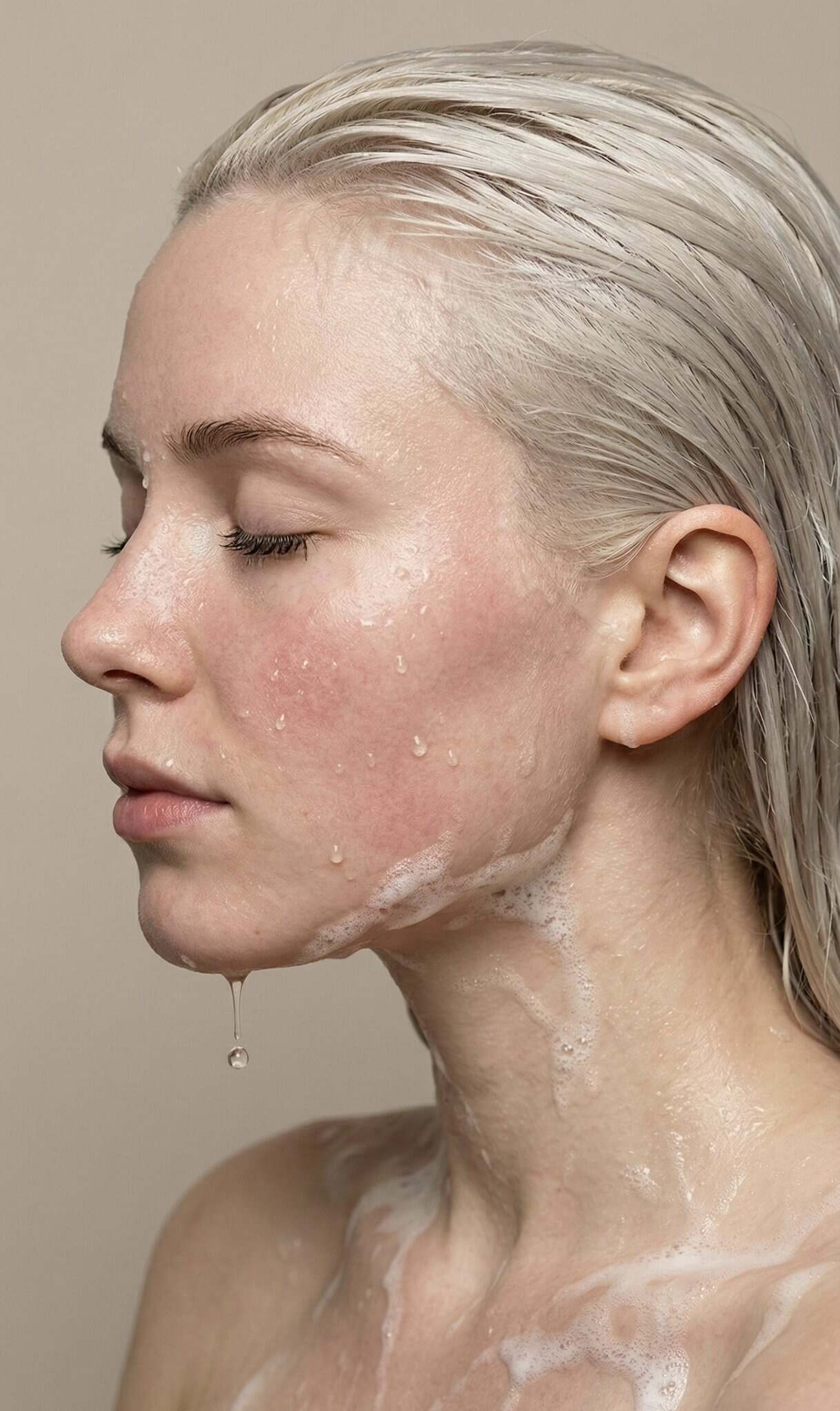 { "prompt_type": "Ultra Photorealistic Portrait", "subject": { "demographics": "Young woman", "perspective": "Side profile view (facing left)", "appearance": { "skin": { "texture": "Hyper-realistic, wet skin texture with visible pores, natural flushed redness on cheeks", "details": "Multiple clear water droplets clinging to the face, white soapy foam/suds along the jawline, neck, and collarbone", "wetness": "A single distinct water droplet dripping from the chin" }, "hair": { "color": "Silver / Platinum Blonde", "style": "Slicked back, completely wet, strands defined by water", "texture": "Fine, straight" }, "face": { "eyes": "Closed, relaxed eyelids", "brows": "Natural, unshaped", "lips": "Soft, natural pink, slightly parted", "expression": "Serene, calm, spa-like relaxation" } } }, "pose": { "head_position": "Turned 90 degrees to the left showing full profile", "body": "Shoulders bare (suggesting nudity or strapless top), neck elongated", "action": "Standing or sitting still while bathing/washing face" }, "styling": { "makeup": "No makeup / fresh face aesthetic", "elements": "White soap suds/foam running down the neck and chest", "vibe": "Clean beauty, skincare campaign, raw and organic" }, "environment": { "setting": "Minimalist studio or bathroom setting", "background": "Solid neutral beige / tan color", "details": "Clean, uncluttered, focus entirely on the subject" }, "lighting": { "type": "Soft diffused studio lighting", "quality": "Even illumination, soft highlights on the wet skin and water droplets", "shadows": "Gentle modeling shadows under the jaw and ear", "direction": "Side lighting accentuating the profile" }, "camera_settings": { "shot_type": "Close-up portrait / Headshot", "lens": "85mm or 105mm Macro lens", "aperture": "f/2.8 to f/4.0 (keeping the face sharp while softening the hair slightly)", "focus": "Sharp focus on the eyelashes and water droplets on the cheek", "shutter_speed": "1/200s (to freeze the dripping water)" }, "technical_details": { "resolution": "8k", "quality_tags": [ "Ultra-detailed", "Macro photography", "Subsurface scattering", "Wet skin shader", "Ray tracing", "Unreal Engine 5 render style", "Raw photo quality" ], "mood": "Intimate, cleansing, peaceful, sensory" } }