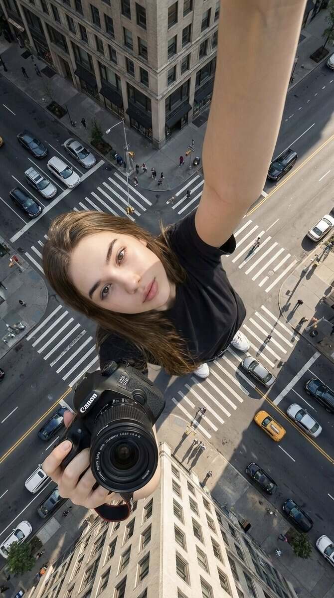 { "type": "image_generation_prompt", "language": "en", "style": "hyper-realistic cinematic selfie photography", "aspect_ratio": "9:16", "identity_preservation": { "use_reference_image": true, "strict_identity_lock": true, "alter_face": false, "alter_skin": false, "alter_hair": false, "alter_gender": false, "notes": "Preserve identical facial features, skin texture, hair, glasses, age, and gender from the uploaded reference image. No synthetic skin or sculptural look." }, "subject": { "gender": "female", "capture_method": "selfie taken by the subject herself", "pose": { "selfie_arm": { "description": "one arm fully straight and completely extended upward holding the camera that takes the selfie", "visibility": "arm clearly visible, straight and dominant in frame", "camera_visibility": "the selfie camera device itself must NOT be visible in the frame" }, "product_arm": { "description": "the other arm fully extended toward the camera holding the attached Canon camera", "importance": "product is closest to the camera and visually dominant" }, "head": { "tilt": "slightly tilted toward the selfie camera" }, "expression": "natural and relaxed facial expression" }, "body_visibility": "full body visible from head to toe", "feet": "feet clearly touching the road surface" }, "composition": { "perspective": "natural selfie perspective at chest height", "camera_angle": "extreme top-down angle, camera above the subject looking directly downward", "layer_depth": [ "product (closest to camera)", "face", "full body", "city environment (background)" ] }, "scale_and_perspective": { "effect": "forced perspective", "subject_scale": "the woman appears extremely giant", "buildings_scale": "buildings appear much smaller, reaching no higher than her knees", "dominance": "the subject visually dominates the entire scene", "realism": "inspiring scale while remaining physically believable" }, "environment": { "location": "real urban intersection", "elements": [ "pedestrian crosswalk", "road markings", "traffic signs", "cars", "bicycles", "pedestrians at realistic human scale" ], "setting": "ground-level urban environment" }, "lighting": { "type": "natural daylight", "conditions": "clear or lightly cloudy sky", "shadows": "soft and realistic", "restrictions": "no fantasy or dramatic lighting" }, "product_rules": { "usage": "use the uploaded Canon product exactly as provided", "distortion": "none", "logo": "unchanged", "appearance": "natural reflections and realistic highlights only" }, "camera_quality": { "realism": "maximum photorealism", "depth": "clear separation of foreground, subject, and background", "artifacts": "none" }, "constraints": [ "No AI-art look", "No plastic or sculpted skin", "No distortion of face or body", "No extra limbs or incorrect anatomy", "No text or watermarks", "No visible selfie camera device" ], "output_goal": "Create a hyper-realistic cinematic selfie image of a woman using her exact reference identity, captured from an extreme top-down perspective in a real urban crosswalk, with forced perspective scale, natural daylight, and a Canon camera product prominently held toward the lens." }