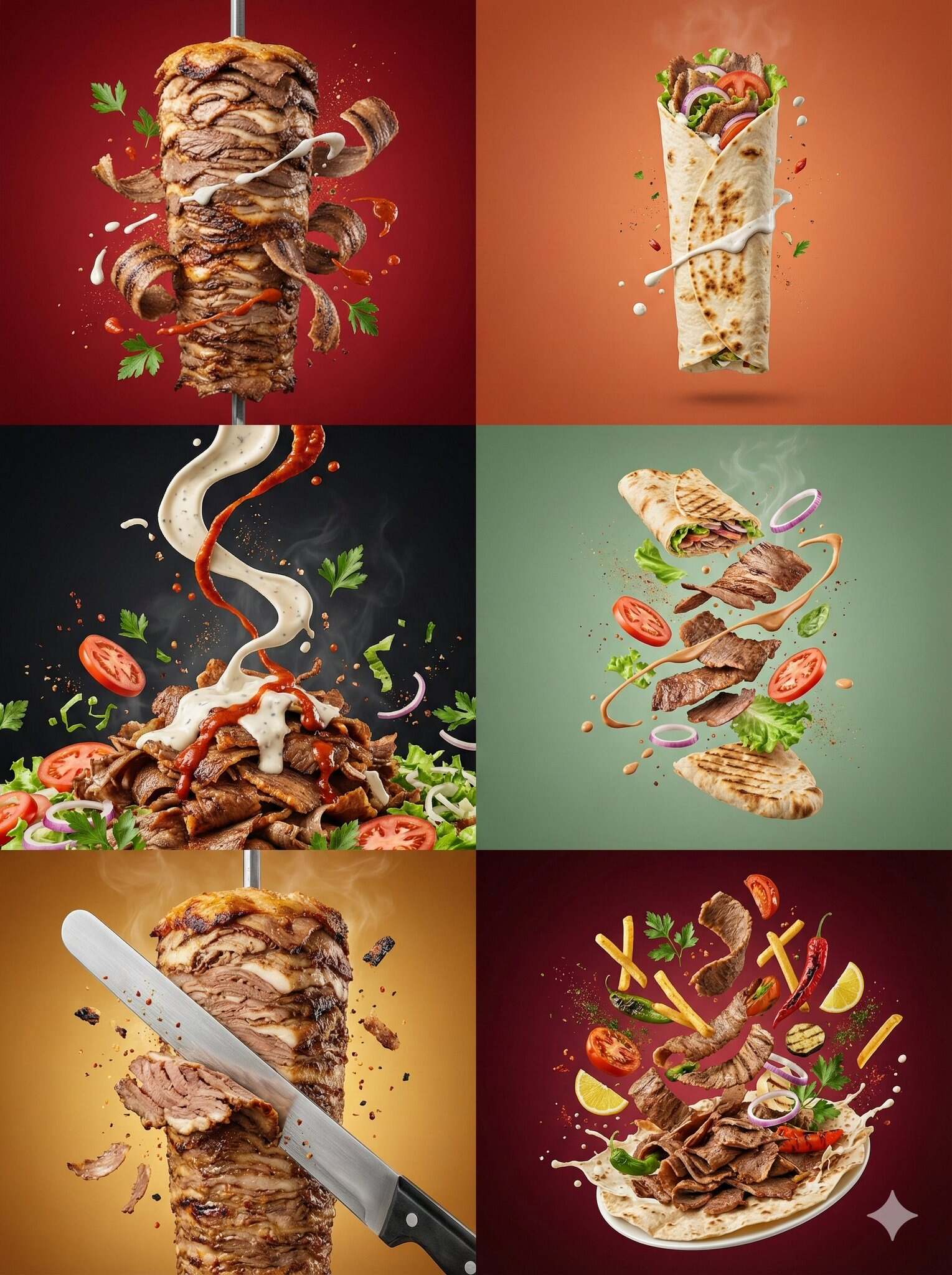 { "resolution": "8K UHD", "aspect_ratio": "3:4", "image_style": "hyper-realistic commercial food photography", "global_settings": { "quality": "Ultra-high detail, razor-sharp focus, premium street food clarity", "lighting": "Controlled studio lighting emphasizing meat texture, char marks, and sauce glistening", "motion": "Frozen mid-air elements with subtle gravity realism", "background_style": "Solid or smooth gradient background, color varies per module", "camera": "High-speed photography look, shallow to medium depth of field", "post_processing": "Rich contrast, warm savory tones, natural shine, appetizing color grading" }, "modules": { "module_1_classic_doner_slice_explosion": { "scene_description": "A dramatic vertical döner stack with flying meat slices and sauce droplets", "doner": { "type": "Traditional Turkish döner kebab slices", "texture": "Thinly sliced beef and lamb mix with visible char marks", "cut": "Paper-thin ribbons", "position": "Stacked vertically and floating mid-air" }, "details": { "char_marks": "Dark caramelized edges with grill stripes", "fat_marbling": "Glistening fat streaks between meat layers", "seasoning": "Visible spice particles on meat surface" }, "motion_effects": { "meat_slices": "Individual döner slices spiraling outward", "sauce": "White garlic sauce and red chili sauce droplets splashing", "herbs": "Fresh parsley leaves floating in air" }, "background": { "color": "Deep crimson red", "texture": "Smooth, seamless" } }, "module_2_minimal_doner_durum_floating": { "scene_description": "Minimalist premium döner dürüm presentation with controlled floating ingredients", "doner": { "type": "Perfectly wrapped dürüm (wrap) cross-section", "arrangement": "Single dürüm cut in half, floating vertically", "surface": "Lightly toasted lavash bread with golden char marks" }, "accent_elements": { "filling": "Layered döner meat, lettuce, tomatoes, onions visible in cross-section", "sauce": "White garlic yogurt sauce drizzling elegantly", "vegetables": "Fresh red tomato slices, crisp lettuce, purple onion rings" }, "motion_effects": { "particles": "Subtle floating spice particles and herb fragments", "drops": "Sauce droplets frozen mid-fall" }, "background": { "color": "Warm terracotta orange", "gradient": "Very soft tonal gradient" } }, "module_3_doner_sauce_pour_drama": { "scene_description": "Cinematic sauce pour over döner meat pile", "doner": { "type": "Mountain of freshly sliced döner meat", "texture": "Highly detailed crispy edges and tender interior" }, "additional_elements": { "sauces": { "white_sauce": { "state": "Thick creamy garlic yogurt sauce pouring from above", "motion": "Frozen in elegant flowing ribbon" }, "red_sauce": { "state": "Spicy red chili sauce drizzling alongside", "motion": "Thin crimson streams intertwining with white sauce" } }, "vegetables": [ "Sliced tomatoes", "Chopped lettuce", "Thinly sliced onions", "Fresh parsley sprigs" ] }, "motion_effects": { "splashes": "Micro sauce splashes on meat surface", "particles": "Floating spice particles and herb fragments", "steam": "Subtle heat vapor rising from meat" }, "background": { "color": "Dark charcoal black", "tone": "High contrast, premium street food aesthetic" } }, "module_4_modern_doner_deconstructed_composition": { "scene_description": "Modern deconstructed döner composition in mid-air", "elements": { "bread": "Pieces of toasted lavash bread floating separately", "meat": "Individual döner slices suspended at different angles", "vegetables": "Tomato slices, lettuce leaves, onion rings floating between layers", "sauces": "Glossy sauce ribbons connecting elements artistically" }, "motion_effects": { "particles": "Ultra-fine spice dust suspended in air", "drops": "Scattered sauce droplets frozen in motion", "steam": "Minimal heat waves rising from meat" }, "background": { "color": "Muted sage green", "texture": "Smooth, seamless" } }, "module_5_rotating_doner_spit_close_up": { "scene_description": "Extreme close-up of döner meat on vertical spit with knife slice frozen in time", "doner_spit": { "type": "Vertical döner tower on rotating spit", "texture": "Layers of seasoned meat with charred outer crust", "detail": "Visible spices, fat marbling, and grill marks" }, "action_elements": { "knife": "Large döner knife mid-slice through meat", "meat_slice": "Fresh slice falling away from spit", "shavings": "Meat shavings and crispy bits floating" }, "motion_effects": { "particles": "Charred bits and seasoning particles in air", "steam": "Heat vapor wisps rising from fresh cut" }, "background": { "color": "Rich golden amber", "texture": "Smooth gradient" } }, "module_6_doner_plate_overhead_explosion": { "scene_description": "Overhead shot of döner plate with ingredients exploding upward", "composition": { "base": "Thin lavash bread pieces on bottom", "center": "Pile of döner meat slices", "explosion": "All ingredients bursting upward in circular pattern" }, "flying_elements": [ "Döner meat slices spiraling", "French fries launching upward", "Grilled peppers and tomatoes", "Fresh parsley and sumac", "Sauce droplets spraying", "Lemon wedges" ], "motion_effects": { "height_variation": "Elements at different heights creating depth", "rotation": "Some elements rotating while airborne" }, "background": { "color": "Deep burgundy red", "style": "Vignette effect focusing on center" } } }, "negative_prompt": [ "text", "logos", "branding", "hands", "people", "utensils beyond döner knife", "full plates visible", "tables", "restaurant interior", "cartoon style", "raw meat", "excessive grease pooling", "burnt or overcooked appearance", "overexposure", "artificial glow", "low detail textures", "unappetizing colors", "plastic-looking food" ] }