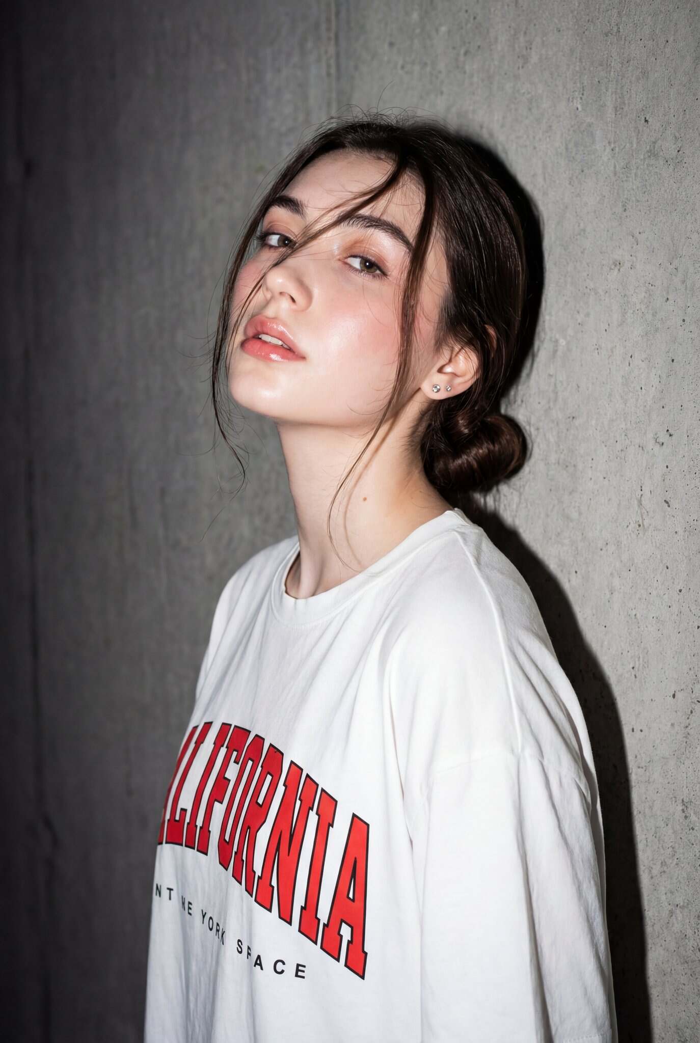 A high-resolution, close-up editorial-style portrait of a young woman standing against a textured gray concrete wall, captured with direct on-camera flash that creates a raw, moody, high-contrast aesthetic. She is positioned slightly angled to the side with her head tilted back and chin lifted, giving an effortlessly cool, candid expression. Her face has a fair, smooth complexion with a natural sheen from the flash, soft rosy blush across the cheeks, minimal eye makeup, lightly defined brows, and glossy natural pink lips that are slightly parted, conveying a relaxed yet confident mood. Wispy strands of her dark brown hair fall loosely across her face, partially covering one eye, while the rest of her hair is pulled back into a low, casual style, enhancing the spontaneous, fashion-editorial feel. Her eyes look slightly upward and past the camera, adding to the detached, artistic vibe. She is wearing a loose-fitting white oversized T-shirt with bold red typography reading “CALIFORNIA” across the chest, along with smaller black text underneath, giving a casual streetwear aesthetic. Small, subtle stud earrings are visible, adding minimal detail without distracting from the overall look. The lighting is harsh and frontal, producing sharp shadows behind her on the wall and emphasizing skin texture, hair strands, and fabric folds, while the background remains simple and uncluttered. The color palette is muted and neutral—gray wall, white shirt, and red lettering—allowing the subject’s face and expression to remain the focal point. The overall atmosphere feels intimate, modern, slightly gritty, and effortlessly stylish, like a candid fashion snapshot captured at night with flash photography. Use this uploaded photo as the only and exact face reference. The generated image must use this same face exactly as shown, without any changes to identity, facial structure, or expression.