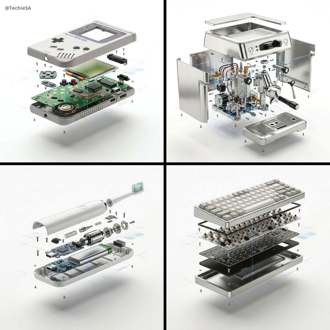[PRODUCT], high-end product advertising, white seamless background, exploded view with inner mechanics revealed, outer shell hovering above core, micro screws and components suspended, perfect alignment guides implied, crisp soft shadow, ultra realistic, macro product photography, 100mm lens look, f/8, 8k