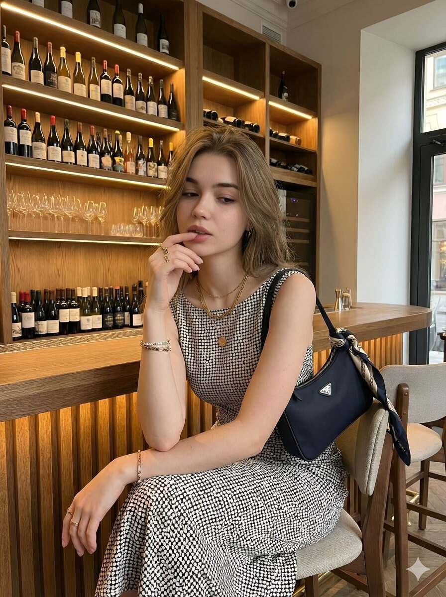 Young beautiful woman with long wavy hair, elegant sleeveless polka dot midi dress black and white pattern, sitting thoughtfully at stylish wine bar counter, hand near lips, luxury wine bottles wall background, Prada navy blue mini bag with silk scarf, gold jewelry, sophisticated chic atmosphere, soft warm lighting, cinematic, highly detailed, realistic Use my uploaded face image as the ONLY facial and identity reference. No other faces, models, datasets, or references are allowed.