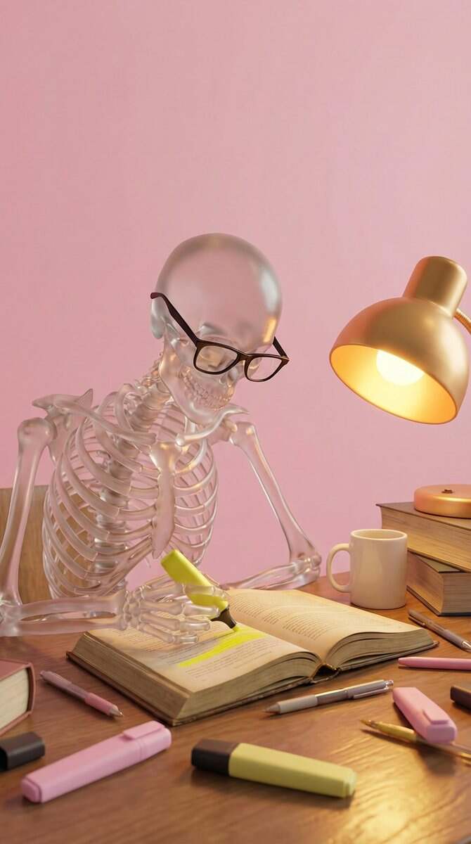 Create a high-quality stylized 3D render of a clear, translucent glass skeleton wearing black-rimmed glasses sitting at a wooden desk. The skeleton MUST be looking down at an open textbook and holding a yellow highlighter, actively highlighting a line of text. The scene MUST feature a warm gold desk lamp on the right side casting a cozy, yellow light that creates glossy reflections on the skeleton's surface. The desk is cluttered with a white coffee mug, a stack of hardcover books on the right, and scattered pens and pastel pink and yellow highlighters. The background MUST be a solid, soft pink wall. The overall aesthetic should be warm, studious, and visually soft. Do not include any text overlays or watermarks.