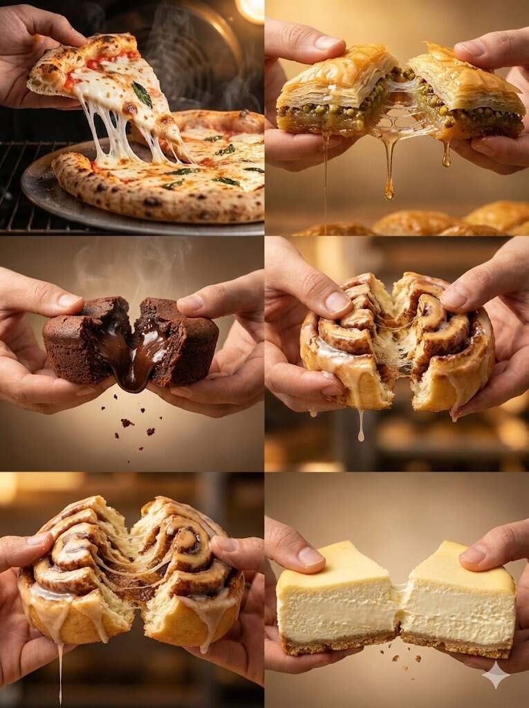 { "aspect_ratio": "3:4", "render_mode": "raw", "series": [ { "index": "1/5", "prompt": "two hands pulling apart a hot freshly baked pizza slice, long elastic mozzarella cheese stretch between the slice and the pie, blistered crust edges, steam rising, crumbs falling mid-air, warm cinematic light, ultra high-detail food action photography", "category": "cheese pull", "lighting": "warm cinematic oven light", "detail_level": "ultra-detailed" }, { "index": "2/5", "prompt": "two hands pulling apart a syrup-soaked baklava piece, thin crispy phyllo layers cracking, rich pistachio filling visible, thick honey syrup stretching and dripping mid-air, golden warm light, cinematic dessert action photography", "category": "syrup & crunch", "lighting": "golden warm light", "detail_level": "ultra-detailed" }, { "index": "3/5", "prompt": "two hands breaking a molten chocolate lava cake in half, glossy dark chocolate flowing out from the center, steam rising gently, crumbs suspended mid-air, soft warm spotlight, cinematic dessert action photography", "category": "molten chocolate", "lighting": "soft warm spotlight", "detail_level": "ultra-detailed" }, { "index": "4/5", "prompt": "two hands tearing a glazed cinnamon roll apart, sticky cinnamon sugar filling stretching in glossy strands, icing dripping slowly, fluffy dough texture visible, cozy warm bakery light, high-detail cinematic food photography", "category": "sticky pull", "lighting": "warm bakery light", "detail_level": "ultra-detailed" }, { "index": "5/5", "prompt": "two hands splitting a classic New York-style cheesecake slice, ultra-creamy interior slowly separating, crumbly biscuit base breaking apart, subtle cream stretch, soft studio warm light, cinematic high-detail dessert photography", "category": "creamy separation", "lighting": "soft warm studio light", "detail_level": "ultra-detailed" } ] }