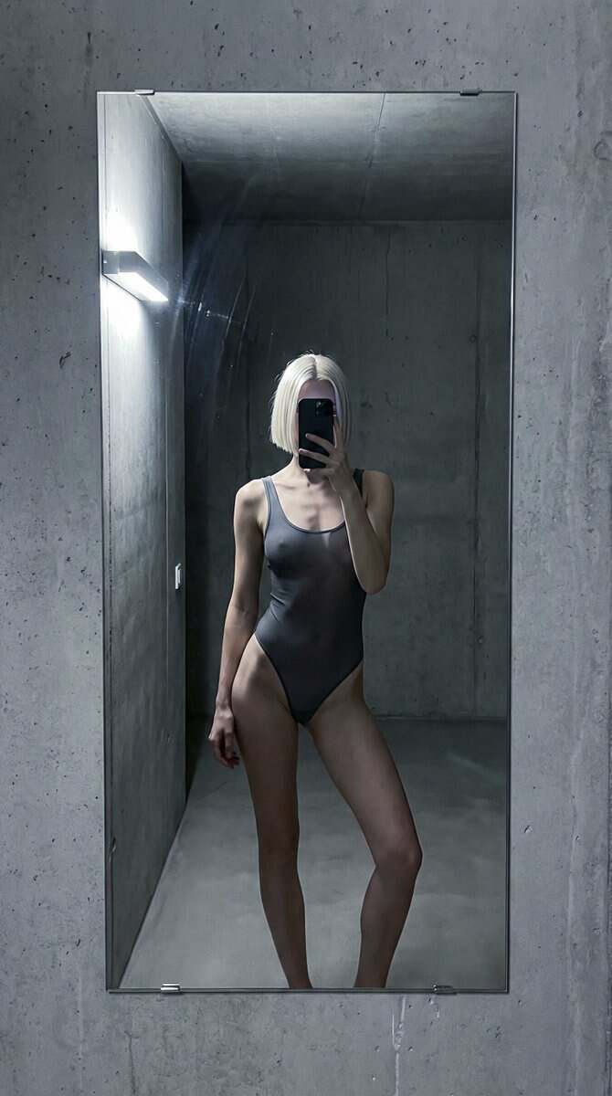 { "meta": { "aspect_ratio": "9:16", "camera": "iPhone rear camera", "lens": "35mm", "quality": "ultra photorealistic", "style": "cold editorial mirror reflection, raw iphone realism, natural skin texture, slight grain" }, "scene": { "location": "empty concrete hallway apartment", "visibility_rule": "only mirror reflection visible, subject never appears directly", "environment_details": [ "tall frameless mirror mounted on concrete wall", "industrial gray walls", "soft shadow gradients", "clean but slightly brutalist interior" ], "time": "very late night", "atmosphere": "silent, detached, fashion-editorial tension" }, "lighting": { "type": "single directional light", "source": "cool LED wall light from side", "color_temperature": "cold white", "effect": "sharp highlights on shoulders and collarbones, deep controlled shadows" }, "camera_perspective": { "pov": "mirror reflection only", "angle": "straight-on, chest-height", "framing": "upper thighs to head visible only inside mirror", "real_world_visibility": "no body parts visible outside mirror", "phone_visibility": "phone covering face in reflection" }, "subject": { "gender": "female", "age_vibe": "young adult", "ethnicity": "Northern European", "hair": { "color": "icy platinum blonde", "style": "short blunt bob", "behavior": "clean lines, barely touching jaw" }, "outfit": { "bodysuit": { "type": "one-piece mesh bodysuit", "color": "smoky graphite gray", "material": "semi-transparent technical mesh", "fit": "tight, sculpting, stretched naturally", "coverage": "fashion-revealing, non-explicit" } }, "pose": { "position": "standing still close to mirror", "legs": { "stance": "asymmetrical", "detail": "one leg straight, one knee slightly bent inward" }, "hips": { "action": "subtle sideways shift creating tension in fabric" }, "arms": { "phone_hand": "holding phone directly in front of face", "free_hand": "hanging loose by side, relaxed fingers" }, "vibe": "cold confidence, model-off-duty, emotionally distant" }, "face": { "visibility": "completely hidden by phone", "effect": "identity erased, body language only" } }, "imperfections": [ "minor mirror streaks", "uneven LED light falloff", "slight handheld camera micro-tilt" ] }
