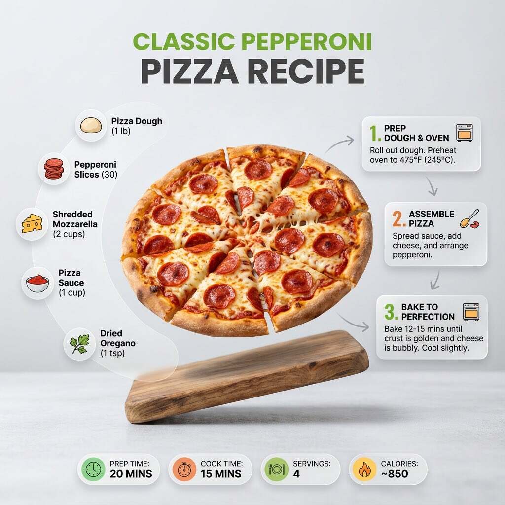 Ultra-clean modern recipe infographic. Showcase [FOOD] in a visually appealing finished form—sliced, plated, or portioned—floating slightly in perspective or angled view. Arrange ingredients, steps, and tips around the dish in a dynamic editorial layout, not restricted to top-down. Ingredients Section: Include icons or mini illustrations for each ingredient with quantities. Arrange them in clusters, lists, or circular flows connected visually to the dish. Steps Section: Show preparation steps with numbered panels, arrows, or lines, forming a logical flow around the main dish. Include small cooking icons (knife, pan, oven, timer) where helpful. Additional Info (optional): Total calories, prep/cook time, servings, spice level—displayed as clean bubbles or badges near the dish. Visual Style: Editorial infographic meets lifestyle food photography. Vibrant, natural food colors, subtle drop shadows, clean vector icons, modern typography, soft gradients or glassmorphism for step panels. Accent colors can highlight key info (calories, prep time). Composition Guidelines: Finished meal as hero visual (perspective or angled) Ingredients and steps flow dynamically around the dish Clear visual hierarchy: dish > steps > ingredients > optional stats Enough negative space to keep design airy and readable Lighting & Background: Soft, natural studio lighting, minimal textured or gradient background for premium editorial feel. Output: 1080×1080, ultra-crisp, social-feed optimized, no watermark