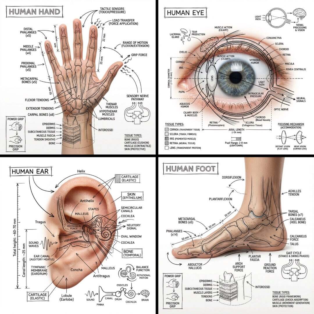 Create an infographic image of [BODY PART], combining a realistic photograph or photoreal render of the object with technical annotation overlays placed directly on top. Use black ink–style line drawings and text (technical pen / architectural sketch look) on a pure white studio background, including: •Key component labels •Internal cutaway or exploded-view outlines •Measurements, dimensions, and scale markers •Material callouts and quantities •Arrows indicating function, force, or flow (air, sound, power, pressure) •Simple schematic or sectional diagrams where relevant Place the title [BODY PART] inside a hand-drawn technical annotation box in one corner. Style & layout rules: •The real object remains clearly visible beneath the annotations •Annotations feel sketched, technical, and architectural •Clean composition with balanced negative space •Educational, museum-exhibit / engineering-manual vibe Visual style: Minimal technical illustration aesthetic, black linework over realistic imagery, precise but slightly hand-drawn feel. Color palette: White background, black annotation lines and text only. No colors. Output: 1080×1080, ultra-crisp, social-feed optimized, no watermark.