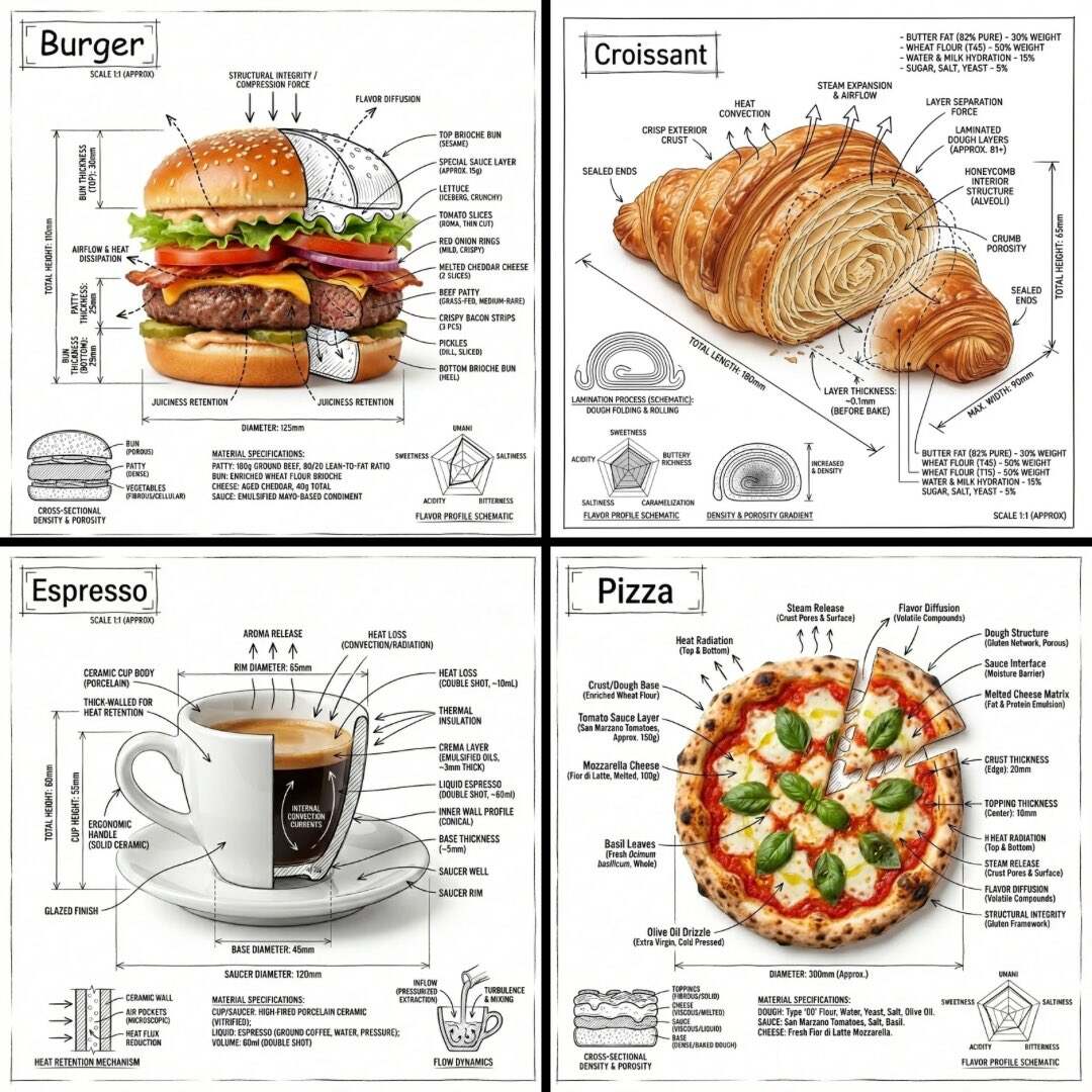 “Create an infographic image of [FOOD], combining a realistic photograph or photoreal render of the object with technical annotation overlays placed directly on top. Use black ink–style line drawings and text (technical pen / architectural sketch look) on a pure white studio background, including: •Key component labels •Internal cutaway or exploded-view outlines •Measurements, dimensions, and scale markers •Material callouts and quantities •Arrows indicating function, force, or flow (air, sound, power, pressure) •Simple schematic or sectional diagrams where relevant Place the title “FOOD” inside a hand-drawn technical annotation box in one corner. Style & layout rules: •The real object remains clearly visible beneath the annotations •Annotations feel sketched, technical, and architectural •Clean composition with balanced negative space •Educational, museum-exhibit / engineering-manual vibe Visual style: Minimal technical illustration aesthetic, black linework over realistic imagery, precise but slightly hand-drawn feel. Color palette: White background, black annotation lines and text only. No colors. Output: 1080×1080, ultra-crisp, social-feed optimized, no watermark.”