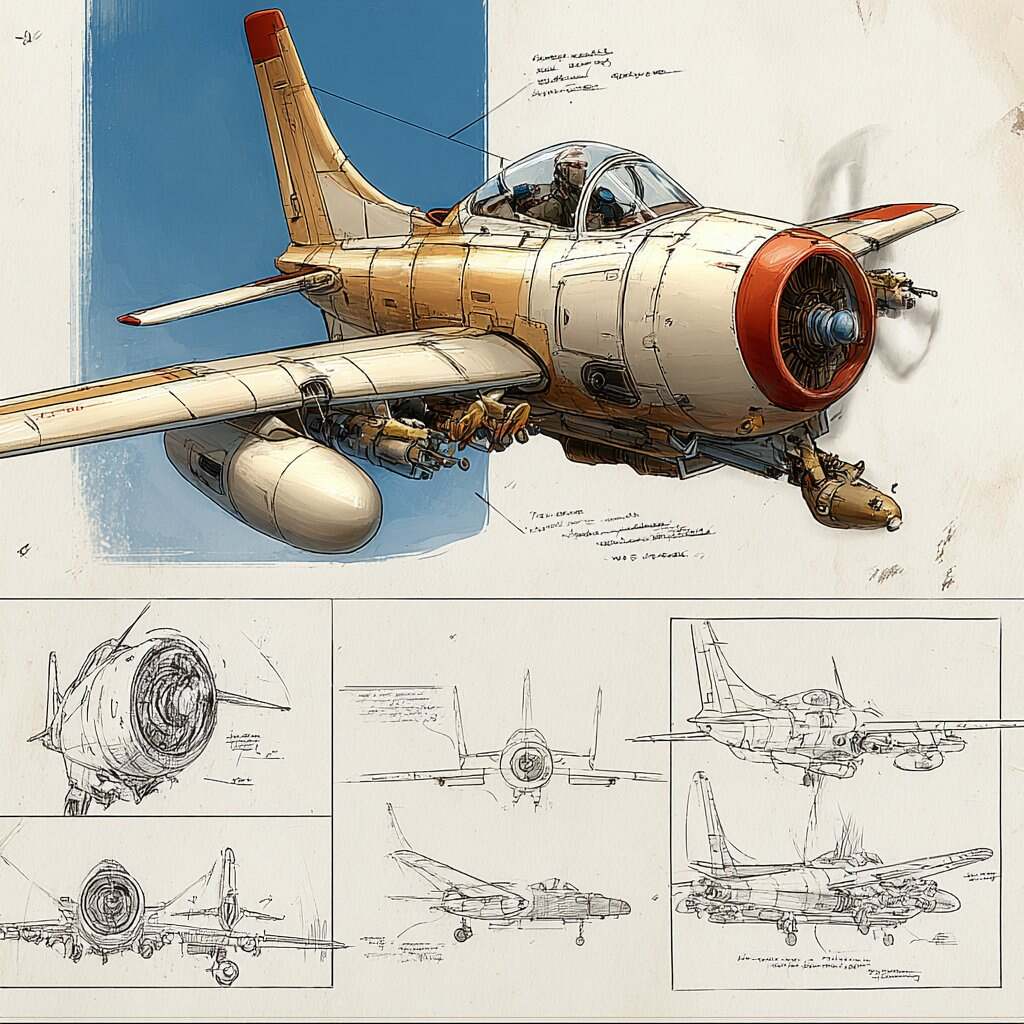 I just discovered this gem in Midjourney: --sref 1151865433 This style is technical–cinematic concept art, halfway between artistic illustration and industrial design. It combines movie and video game production concept art, with ship, vehicle, and character designs that look like pages from an artbook, together with illustrated blueprint-style technical sketches and loose digital painting using ink and gouache. It is a perfect style for artbooks, worldbuilding, prop design, technical storyboards, and cohesive sci-fi universes. And the best part is that you do not need to add tokens like blueprint, sketch, or character sheet in the prompt. The style reference applies all of that by itself. You only need to write the character or object you want to depict.