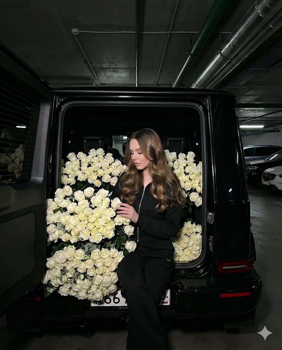 { "A girl sitting in the black open trunk of a Gelik in an underground parking lot, surrounded by many flowers; the entire trunk is filled with white roses. She is wearing a black tracksuit. Her hair is long, styled in the Old Money style. Her lips are painted soft matte pink, and her eyelashes are lush. She is looking at the flowers in the trunk, posing like a fashion shoot.", "pose": "Seated inside the trunk with legs bent slightly, hands lightly touching the flowers, looking at the roses with a gentle, contemplative expression." }, "environment": { "location": "Underground parking lot", "lighting": "Flash photography, high contrast to highlight the girl and white roses, subtle reflections on the car's surface", "background": "Concrete walls and floor of parking lot, dim ambient light" }, "objects": [ { "type": "Car", "model": "Gelik", "color": "Black", "position": "Open trunk facing camera" }, { "type": "Flowers", "species": "Roses", "color": "White", "placement": "Entire trunk filled, some spilling slightly around the girl" } ], "style": { "photography": "Fashion editorial, flash photography, cinematic", "format": "3:4", "mood": "Elegant, serene, high-end fashion vibe" }, "reference_image_ids": ["<your_uploaded_photo_id>"]
