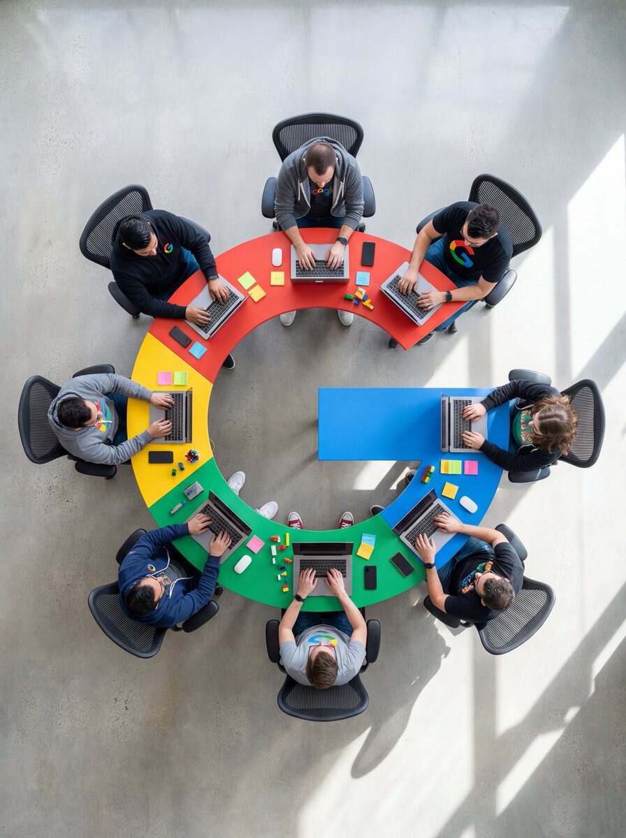 Ultra-wide-angle hyper-realistic top-down flat lay photography. The central focus is a custom physical conference table meticulously shaped like [SHAPE/NUMBER/SYMBOL]. The table features [MATERIAL/TEXTURE/COLOR] and placed on a [FLOOR COLOR] floor, creating significant negative space around it for a clean, minimalist composition. A group of [NUMBER] real people are sitting around the edges of this [SHAPE]-shaped table. [POSITIONING: e.g., 3 on each side, 1 top/bottom] Actions: [DESCRIBE PEOPLE'S ACTIONS, e.g., working on laptops, drinking coffee]. Lighting & Quality: Professional studio lighting with crisp, distinct drop shadows that define the [SHAPE] silhouette on the floor. 8k resolution, sharp focus, cinematic commercial aesthetic.