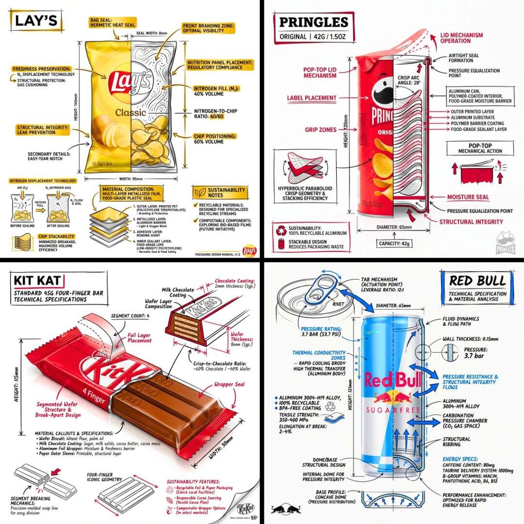 Create a branded technical infographic of a [SNACK], combining a realistic photograph or photoreal render of the product with technical annotation overlays placed directly on top. Use black ink–style line drawings with strategic [BRAND COLOR] accents (architectural sketch look) on a pure white studio background, including: • Key component labels • Internal cross-section showing structure, layering, or internal design • Measurements, dimensions, and specifications • Material callouts with composition and quantities • Arrows indicating function for primary features and structural integrity • Simple schematic or sectional diagram showing key mechanical or design elements • Sustainability callouts Title placement: Inside a hand-drawn technical annotation box with accent border reading the product name in bold font, positioned in upper corner. Style & layout rules: • The realistic product remains clearly visible • Annotations feel sketched, technical, and architectural • Accents used for highlight (20-30% of linework), black for primary technical lines (70-80%) • Clean composition with balanced negative space • Educational, food-engineering vibe with premium branding • Include subtle brand logo mark in corner Visual style: Minimal technical illustration aesthetic, black linework with accents over realistic imagery, precise but slightly hand-drawn feel. Color palette: White background, black annotation lines/text, [BRAND COLOR] for accents and key callouts only. Output: 1080×1080, ultra-crisp, social-feed optimized, no watermark
