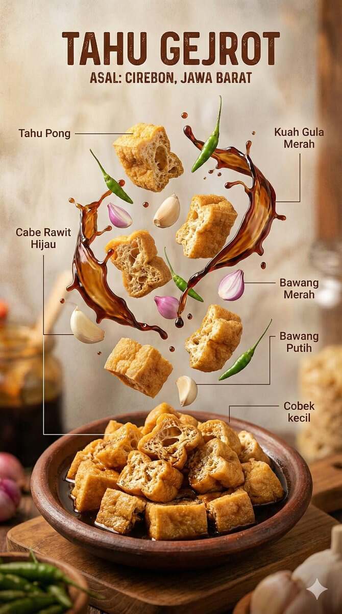 { "image_prompt": { "type": "Hyper-realistic food infographic", "subject": { "cuisine": "Indonesian", "base_element": "Traditional bowl with steaming hot dish at the bottom", "levitating_ingredients": [ "Juicy meat", "Crispy tofu", "Glossy sauce splashes", "Fresh herbs", "Chilies", "Lime", "Garlic", "Fried shallots" ] }, "composition": { "layout": "Clean vertical composition", "arrangement": "Realistic gravity-defying/floating elements", "background": "Rustic wooden surface", "visual_hierarchy": "Bowl anchored at bottom, ingredients rising vertically" }, "graphic_design_elements": { "labels": "Clear Indonesian text", "lines": "Thin white pointing lines", "style": "Editorial infographic layout, professional food magazine style" }, "lighting_and_mood": { "lighting": "Cinematic studio lighting", "color_palette": "Warm tones", "effects": "Dramatic steam, motion-frozen ingredients" }, "technical_specs": { "camera_settings": "Shallow depth of field, sharp focus, DSLR look", "details": "Ultra-detailed textures", "resolution": "8K ultra-realistic" } } }