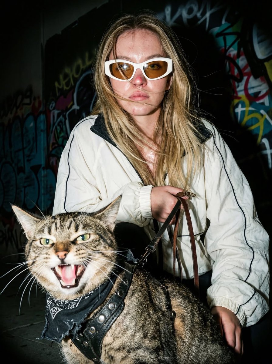 { "image_prompt_data": { "subjects": { "human": { "appearance": "Young woman with long, tousled blonde hair falling over shoulders.", "facial_features": "Neutral to serious expression, visible rosy mark or redness on the bridge of the nose, glossy lips.", "pose": "Crouching or leaning forward, hand gripping a leather leash." }, "animal": { "type": "Tabby cat (brown, black, and grey stripes).", "expression": "Mouth wide open in a hiss, meow, or yawn; visible teeth and tongue; intense and energetic expression.", "position": "Foreground, sitting or standing while leashed." } }, "attire_and_accessories": { "human_clothing": "White nylon track jacket or windbreaker with black piping/stripes running down the sleeves; retro sporty aesthetic.", "eyewear": "Thick-framed white rectangular sunglasses with amber/orange tinted lenses.", "animal_gear": "Black leather harness adorned with metal studs, black paisley bandana around the neck.", "props": "Brown leather leash held taut." }, "setting_and_background": { "location": "Urban exterior at night.", "background": "Dark wall covered in colorful, blurred graffiti tags (blue, yellow, red paint visible).", "atmosphere": "Gritty, underground, street-style vibe." }, "lighting_and_style": { "lighting_technique": "Direct camera flash (flash photography), hard lighting with high contrast, bright foreground subjects against a dark background.", "visual_style": "Paparazzi style, candid, edgy fashion editorial, raw and realistic.", "color_palette": "High contrast; bright whites, deep blacks, amber tints, and muted graffiti colors." }, "technical_specifications": { "quality": "4K, Ultra HD, photorealistic.", "details": "High resolution, sharp focus on the woman and cat, detailed texture on the cat's fur and the jacket fabric.", "aspect_ratio": "Portrait." } } }
