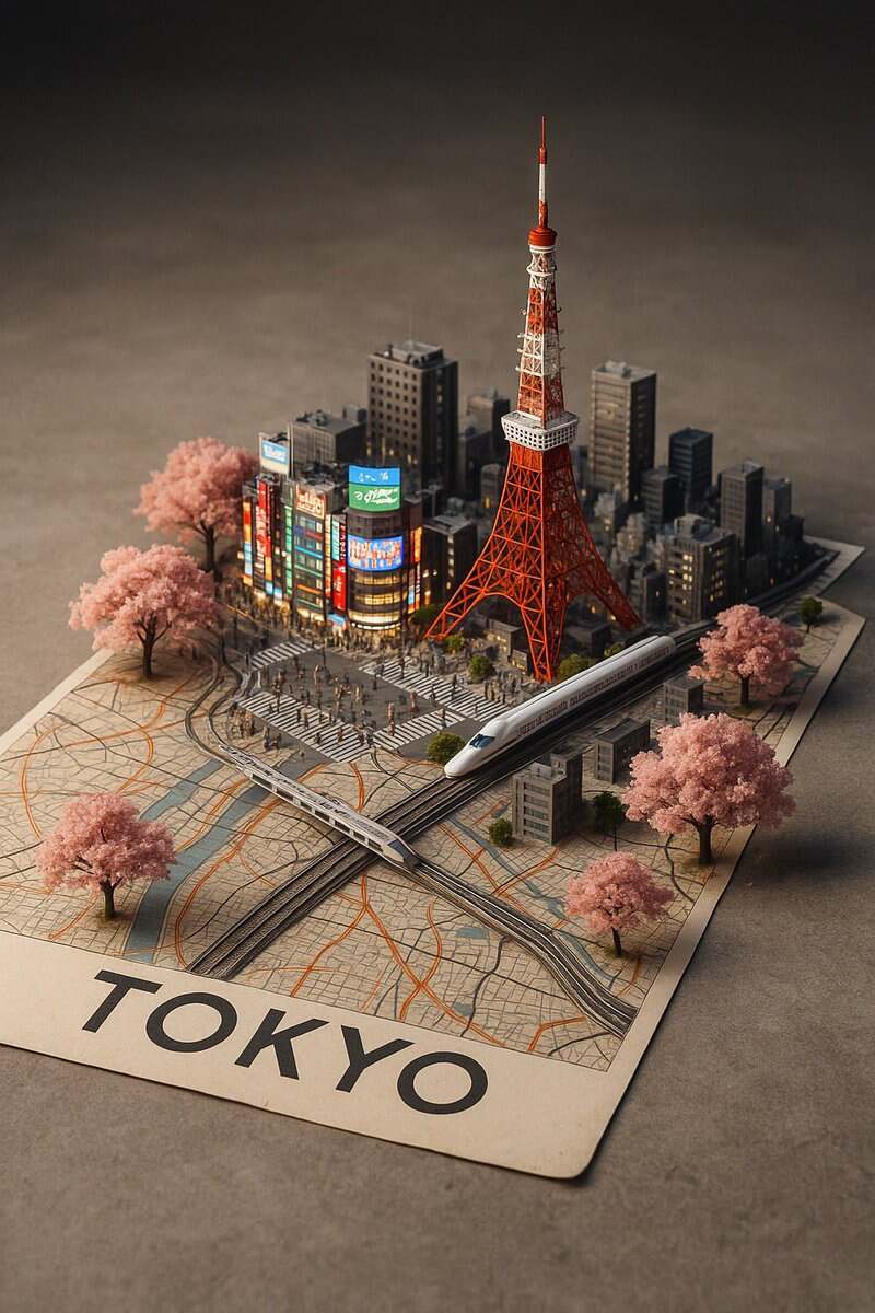 A street-style map of {CITY_NAME} placed on a {MAP_SURFACE}, with a photorealistic miniature version of {CITY_NAME} emerging from it {LANDMARK_1},{LANDMARK_2},{LANDMARK_3}, {NATURE_ELEMENT}, {URBAN_LIFE_ELEMENT}, {ICONIC_TRANSPORT},and {EXTRA_DETAIL}.All elements grow from the map like a 3D urban diorama. Studio soft lighting, cinematic depth, 2:3 format