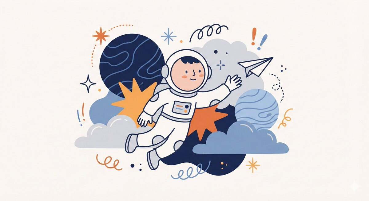 Create a whimsical, playful illustration featuring [CHARACTER / SUBJECT] as the central focus. The character is drawn with simplified features, a small rounded head, and minimal facial detail, wearing [HEADWEAR / CLOTHING DESCRIPTION]. They are positioned among oversized abstract shapes and organic elements such as [FLORAL / SYMBOLIC OBJECTS], creating a sense of imaginative scale. The character is interacting with [OBJECT / ACTION], adding narrative interest. Decorative graphic elements like [SYMBOLS: exclamation points, speech bubbles, scribbles, notes, etc.] float around the subject to enhance expression and energy. Use clean, simple linework and a limited color palette of [PRIMARY COLORS], keeping the illustration bold and cohesive. The background is a soft neutral tone such as beige or off-white. The overall style is modern, flat, and illustrative, with a lively, creative, and slightly abstract atmosphere.