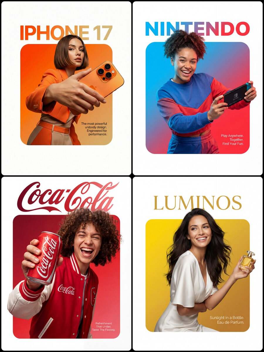 A professional high-end graphic design advertisement composition on a pure solid white canvas. Centered is a perfectly symmetrical, large solid rounded square (not a hollow frame). The entire interior of this square is filled with a smooth, vibrant color gradient fading from [Top-Left Color/Hex] to [Bottom-Right Color/Hex]. A [Description of Character] is positioned such that the bottom of their torso is perfectly flush and aligned with the very bottom edge of the square, leaving no thick colored border visible beneath them. Crucially, the person and their clothing maintain natural, realistic colors and textures, illuminated by professional studio lighting that is independent of the background gradient (preventing any color cast on their skin or clothes). They are firmly and realistically gripping [Product Description]. Crucially, the top of their head and hair break the top boundary of the square, partially overlapping the white background. Their hands and the [Product Name] also break the side boundaries for a powerful 3D breakout effect, extending onto the white canvas. Typography Layout: At the top, in the white space distinctly above the square with a clear gap, is the [Font Style] brand text '[Brand Name]' in [Top Text Color]. In the bottom-right corner, layered directly on top of the gradient inside the square, is a block of small, thin, clean [Bottom Text Color] descriptive text: '[Slogan/Tagline]'. The lighting is [Lighting Type: e.g., Sharp/Soft], crisp, and commercial, emphasizing the textures of both the subject and the product."