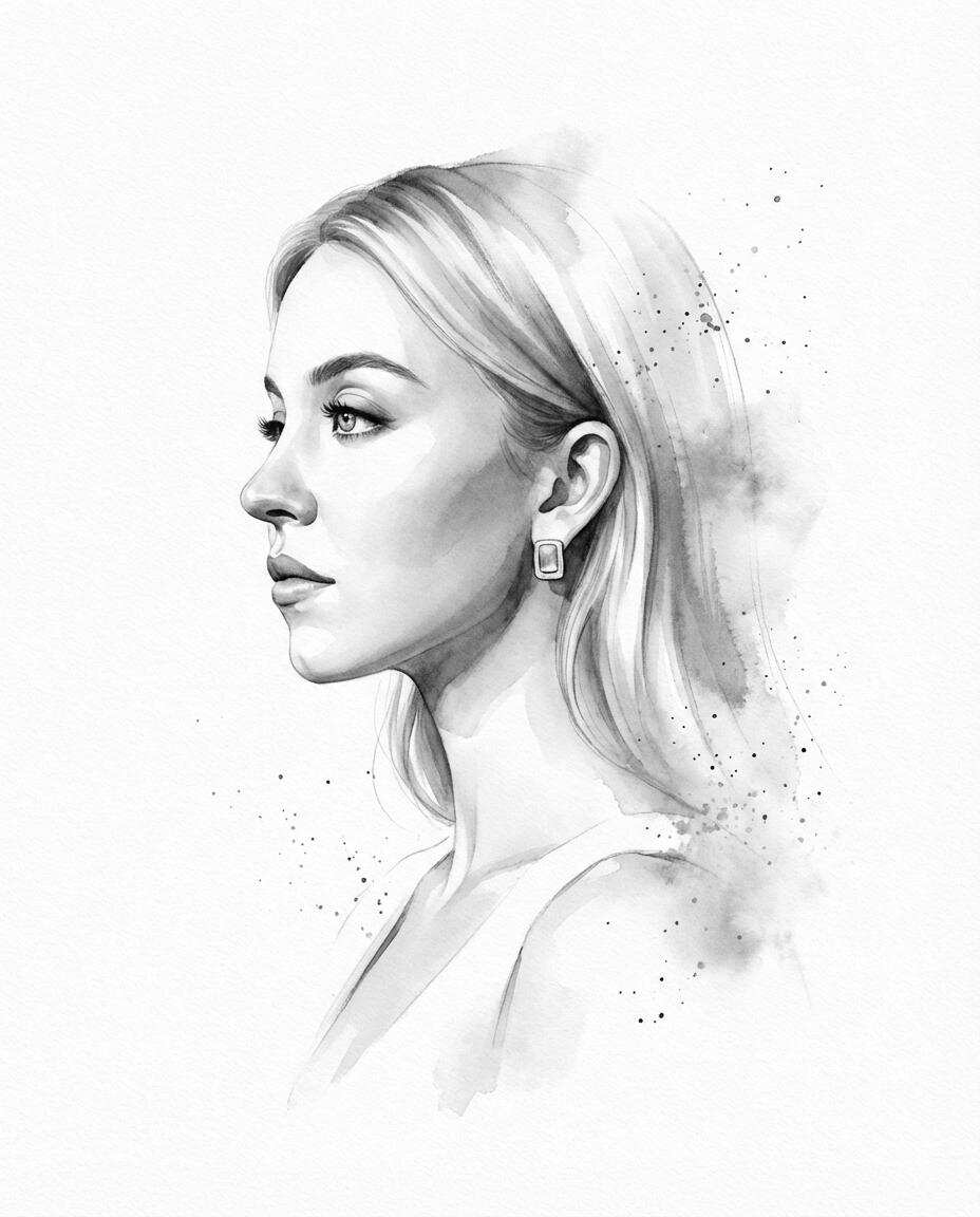 Transform the input photo into a refined monochromatic ink portrait on a pure white background. Clean side profile facing left, preserving exact facial identity and proportions. Soft charcoal-gray ink with subtle tonal variation, controlled splatter accents, delicate watercolor diffusion, and faint mist-like dispersion along the edges.