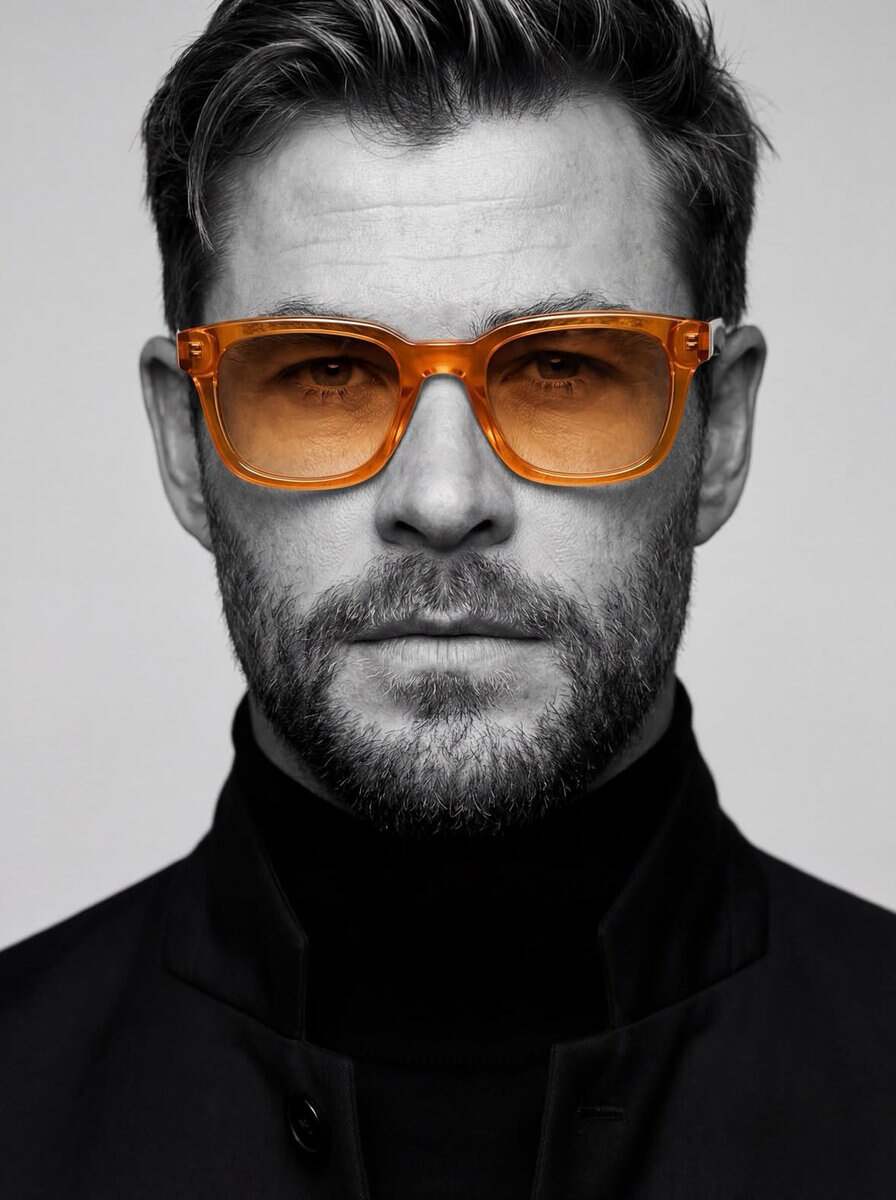 Ultra-realistic studio portrait of a man, close-up headshot, centered composition, neutral expression, sharp facial details, textured skin, clean grooming, wearing a black turtleneck and dark tailored coat, modern minimalist fashion, monochrome black and white photography style, only the glasses in color (translucent amber/orange frame), high contrast lighting, soft studio light, cinematic shadows, editorial fashion photography, plain light background, 85mm lens, shallow depth of field, ultra detailed, photorealistic, magazine quality, 8K.