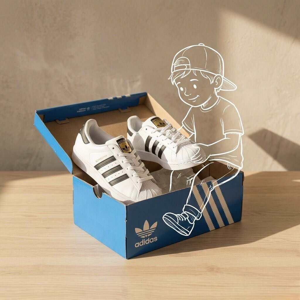 Product description and its placement], minimalist product photography, clean warm studio scene, textured beige wall in the background, soft directional sunlight creating long shadows, simple table surface, the product placed in a playful conceptual composition, overlaid with a hand-drawn white outline doodle [character] interacting with the product, mixed media style combining real photography and sketch illustration, premium branding feel, shallow depth of field, ultra-realistic, no extra text, no watermarks, 8K, 1:1.