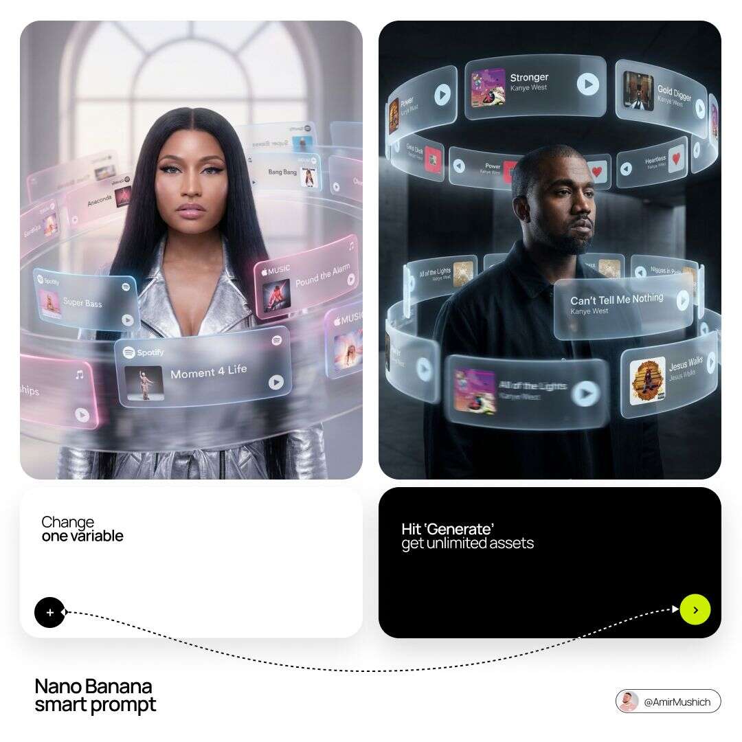 [PERSONE]: Enter the music artist name here. Goal: Generate a cinematic, dreamlike AR (Augmented Reality) visual featuring [PERSONE] as the central subject, surrounded by an orbiting system of floating music interface cards. 1. THE SUBJECT & DYNAMIC TRACKLIST - Character: A high-quality, realistic portrait of [PERSONE] as the central figure. - AI AUTOMATION (CRITICAL): Based on the name provided in [PERSONE], identify their top 8 most popular songs. Automatically replace the placeholder list below with these real song titles. - Featured Tracks: [Placeholder for songs like: century, rottweiler, 4 raws, phantom, mist, cali man, LV sandals]. Each song title must appear on its own floating 3D interface card. 2. AR INTERFACE & CARDS - Style: Numerous 3D Spotify and Apple Music interface cards orbiting the subject at varying depths. - Material: Translucent frosted glass (glassmorphism) with soft rounded edges and subtle glowing borders. - Movement: Some cards are in the extreme foreground, partially obscuring [PERSONE], while others drift into the distance behind the figure. - Visual Accents: Dynamic motion blur on the edges of the cards to suggest a swirling, orbiting movement. 3. LIGHTING & COMPOSITION - Lighting: Natural tones with enhanced professional photo quality. The soft glow from the interface cards subtly illuminates the face of [PERSONE]. - Focus: Strong depth of field. The background and extreme foreground cards are artistically blurred, keeping the focus sharp on the artist and the closest player interfaces. - Composition: A cinematic wide or medium shot that emphasizes the scale of the floating AR elements. 4. AESTHETIC - High-end editorial music photography, futuristic AR concept, clean and airy vibe. 8k resolution, sophisticated lighting, and realistic textures on the glass cards.