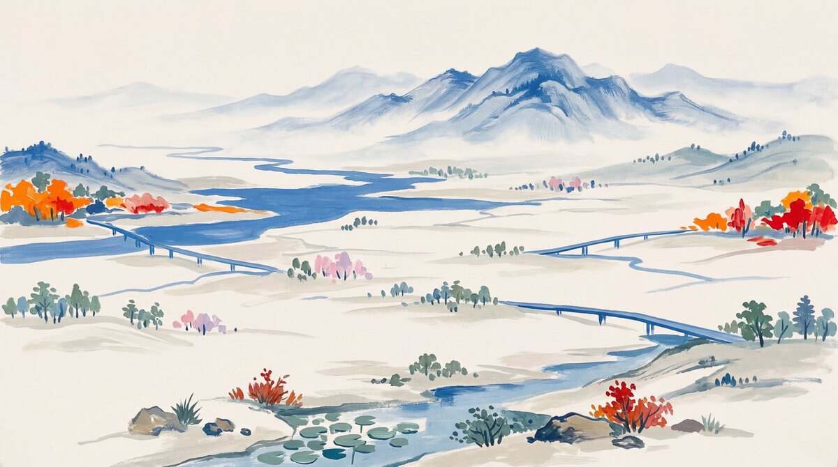 使用以 #f6f4f0 为主背景,#2d6dc3 为主蓝色,同时也包含一些橙色元素,制作了一张山水远景风景画。