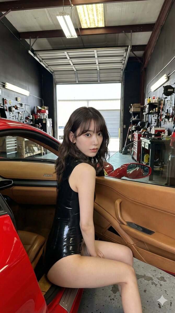 { "meta": { "aspect_ratio": "9:16", "quality": "photorealistic", "resolution": "4k", "camera": "Smartphone camera", "lens": "Standard lens", "style": "Candid garage photography, natural light mixed with overhead fluorescent", "composition": "Full-body shot of Sakura Miyawaki sitting on the door sill of a red sports car in a garage, looking back at the camera." }, "scene": { "location": "Car garage/workshop interior", "environment": ["Interior and open door of a red Ferrari", "Concrete floor", "Metal garage door and dark walls", "Workshop equipment and shelving in the background"], "time": "Daytime (indoors)", "atmosphere": "Casual, industrial, candid" }, "lighting": { "type": "Mixed artificial and ambient daylight", "source": "Overhead fluorescent shop lights and light from an open garage door", "effect": "Functional, even lighting with some shadows and highlights on the car and subject." }, "subject": { "identity": "Sakura Miyawaki, the Japanese K-pop idol with her signature large, deep-set double eyelid eyes, a high straight nasal bridge, and a delicate pointed chin. Her hair is long, wavy dark brown, almost black, styled with soft curtain bangs.", "body": { "pose": "Sitting on the red door sill of the car, body turned towards the interior.", "physique": "Slender, athletic hourglass figure with elegant proportions" }, "outfit": { "clothing": "Glossy black latex bodysuit, black stiletto pumps." } }, "realism_focus": { "textures": "Wavy hair strands, glossy black latex of bodysuit, leather car interior, metal door sill, rubber tires, concrete floor", "imperfections": "Natural creases in clothing, realistic reflections on car paint and interior" } }