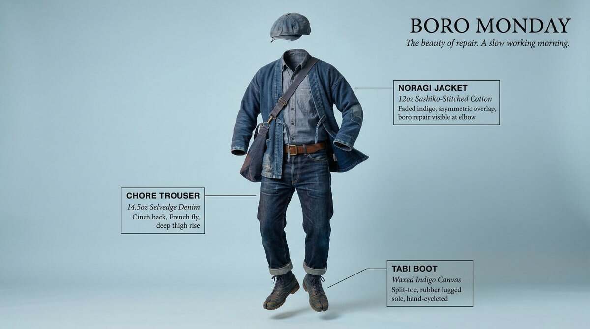 Complete [STYLE] outfit floating in its exact worn position around an invisible body with every piece suspended mid-breath, mid-billow. LOOK (bottom to top): [FOOTWEAR] → [BOTTOMS] → [TOP] → [LAYER] → [ACCESSORIES] → [JEWELLERY] → [HEADWEAR] FABRIC PHYSICS: each material true to its weight, wool hangs, silk drapes, denim holds its crease, leather keeps its shape. Every edge lifting slightly as if caught in one silent gust. LABELS: hairline leader to floating label box. "[GARMENT]" uppercase / "[FABRIC]" italic / "[ONE DEFINING DETAIL]" LIGHTING: soft directional from upper left + warm fill from below catching linings and sole edges + cool rim outlining the silhouette. BACKGROUND: [COLOR] seamless, fashion-forward. TITLE: "[LOOK NAME]" elegant serif type, top right. SUBTITLE: "[MOOD / OCCASION]" italic. Mood: high-concept levitation editorial, the outfit exists, the person is imagination. 4K, extraordinary fabric fidelity, tack sharp.