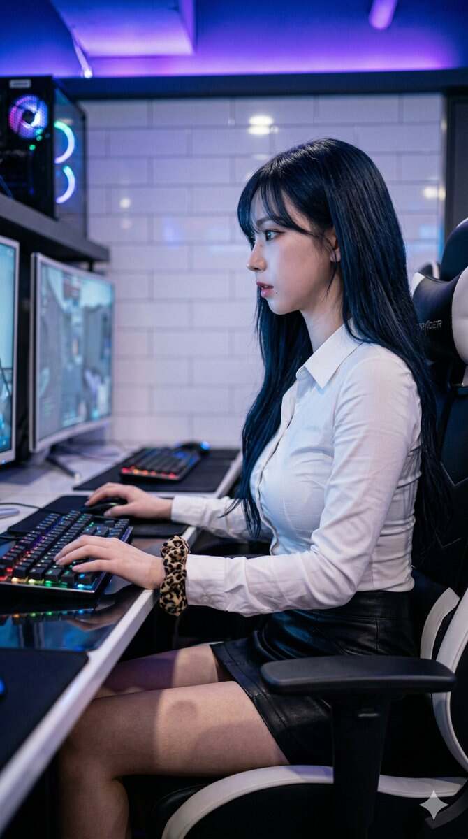 { "meta": { "quality": "ultra-photorealistic, raw style, 8k, highly detailed", "camera_model": "Sony A7R V, Full-frame mirrorless", "lens_spec": "35mm prime, f/1.8 aperture", "aspect_ratio": "9:16", "style_preset": "candid realism, gaming aesthetic", "technical_rules": "natural skin texture, no airbrushing, realistic thigh physics" }, "scene": { "location": "modern Korean PC Bang (gaming cafe)", "time_of_day": "night, artificial indoor lighting", "atmosphere": "immersive, focused, cinematic gamer vibe", "background_elements": [ "white subway tile wall", "dual monitor setup", "glowing PC tower", "gaming chair with headrest" ], "props": [ "mechanical gaming keyboard with RGB lighting", "gaming mouse", "large mousepad", "scrunchie on wrist" ] }, "subject": { "identity": { "name_reference": "Karina from aespa", "biometric_details": "sharp V-shaped jawline, large feline eyes, small nose, perfectly symmetrical features", "ethnicity_age": "Korean, early 20s" }, "physical": { "body_type": "slender hourglass, toned thighs, elegant posture", "skin_details": "porcelain skin tone, soft glow, realistic skin texture", "hair_style": "long midnight blue-black straight hair, soft side-swept bangs", "facial_features": "delicate features, sharp gaze" } }, "wardrobe": { "outfit_description": "tight-fitting white button-down long-sleeve shirt and a black leather miniskirt", "materials": "crisp matte cotton, glossy genuine leather", "footwear": "not visible", "accessories": [ "leopard print scrunchie on wrist" ] }, "pose_action": { "primary_pose": "sitting in a black and white gaming chair, profile view", "body_language": "legs crossed, right hand on mouse, left hand on keyboard, leaning slightly forward", "expression": "intense focus on the screen, slightly parted lips", "interaction": "engrossed in high-stakes gaming" }, "lighting": { "setup": "cool blue ambient neon lighting from the monitor and ceiling", "effects": "rim lighting on silhouette, soft blue glow on face, sharp RGB keyboard reflections", "color_grading": "cool tones, high contrast, vibrant blues and purples" }, "composition": { "shot_type": "medium shot, side profile portrait", "camera_angle": "eye-level, slightly angled from the side", "focus_point": "sharp focus on profile and hands, emphasizing the gaming stance", "depth_of_field": "shallow depth of field, background tiles slightly blurred" }, "realism_focus": { "textures": [ "leather grain", "fabric tension on shirt", "keyboard keycap texture" ], "imperfections": [ "natural clothing folds", "slight skin compression on thighs from sitting" ] } }